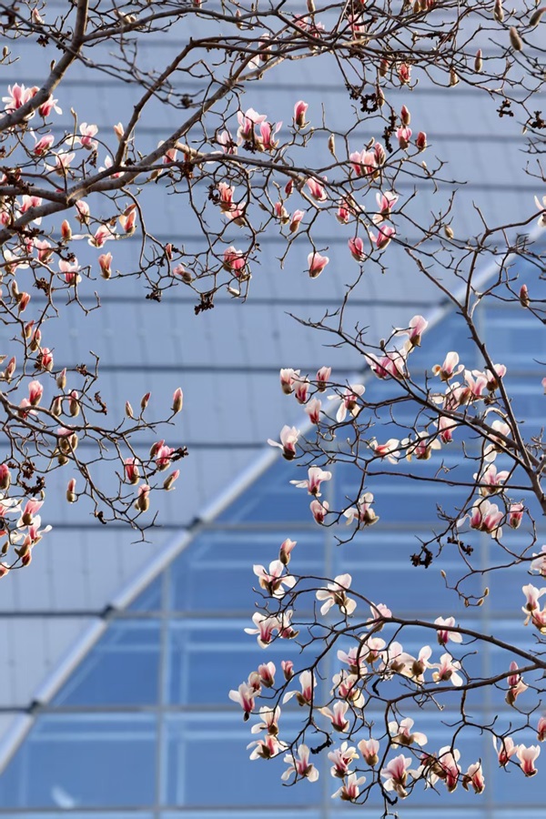 春日最动人的景致莫过于枝头的玉兰。长安街边玉兰与国家大剧院穹顶相映,乐声丝丝入耳,花香缕缕沁脾。光秃枝桠上,硕大的花朵虽无叶片点缀左右,却将“玉洁冰清”的气质演绎得淋漓尽致。(摄影:姚咏梅)