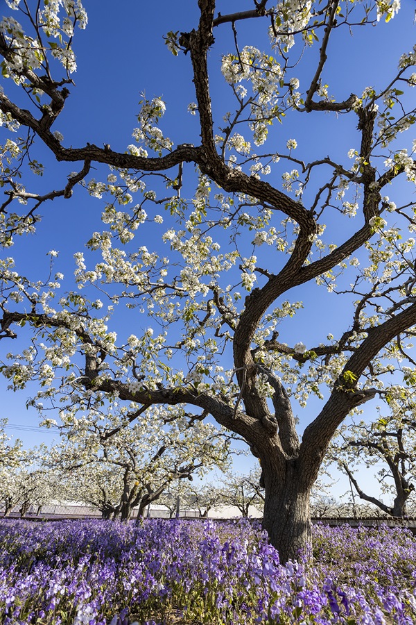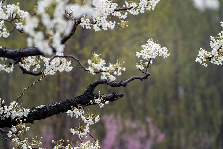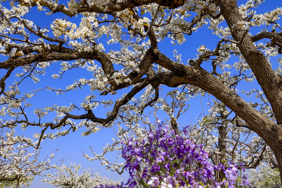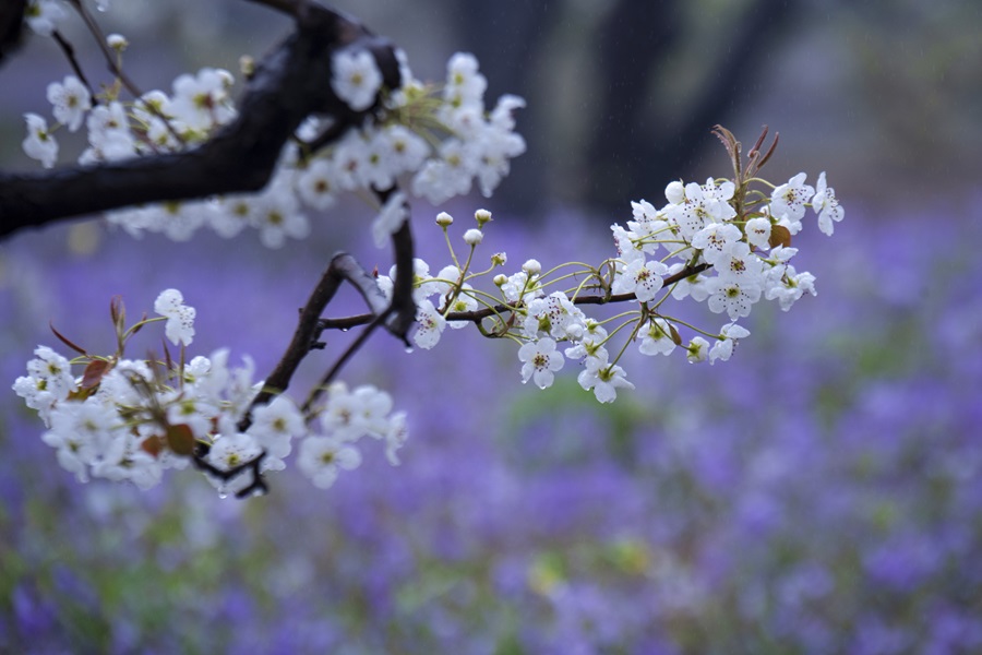 一树梨花 伴紫兰嫣。 (摄影:刘瑞春)