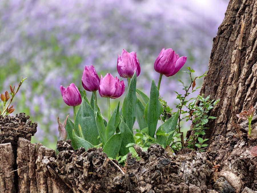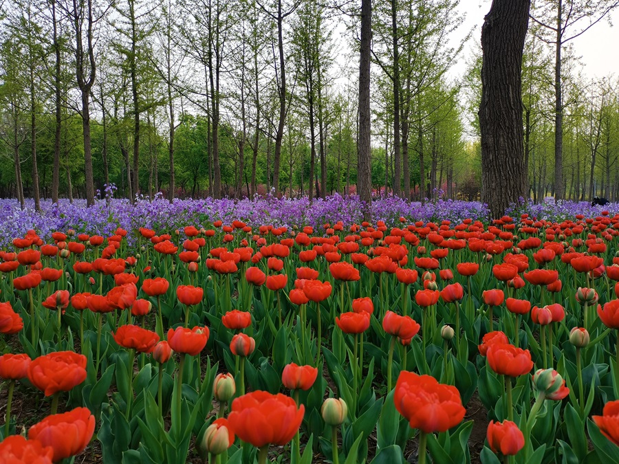 绿色港湾,缤纷郁金香与二月兰交叠,织就一条浪漫明媚的春日花廊。(摄影:崔慧兰)