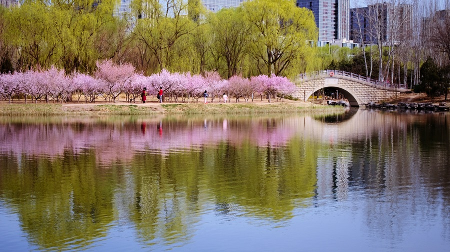 念坛春色。游人漫步在花间湖畔,春色与水中倒影两两相映。(摄影:崔慧兰)