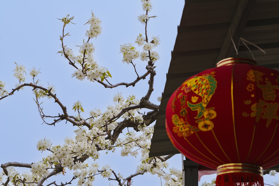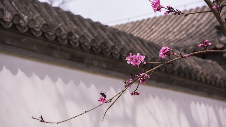 一枝独秀映黛瓦,团河行宫绽春枝。(摄影:刘瑞春)