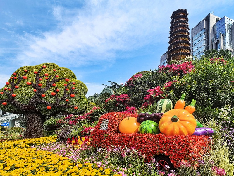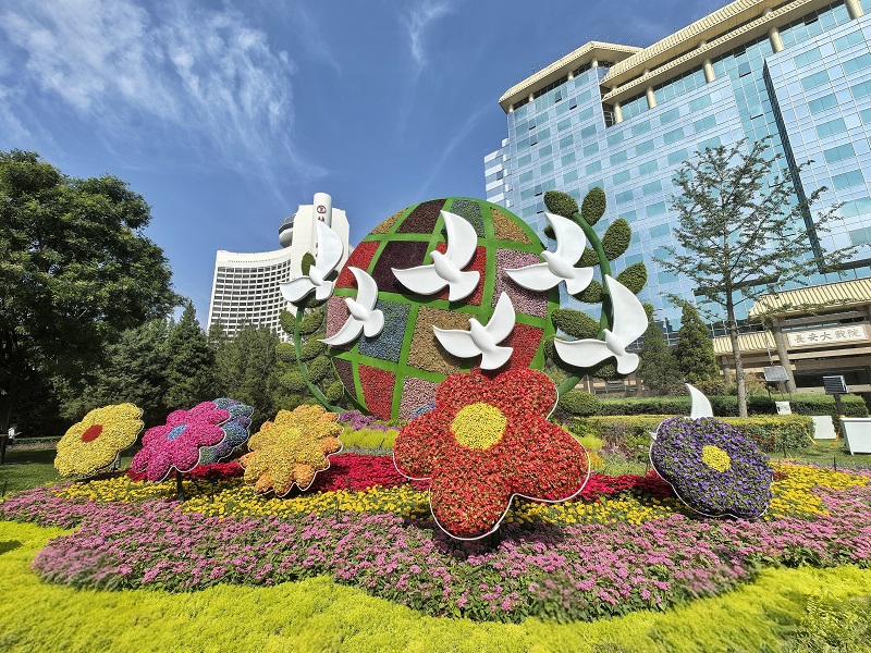 以“奋进新征程、建功新时代”为主题,2025年国庆,天安门广场布置“祝福祖国”巨型花篮,长安街沿线设置10组立体花坛,展现“国家富强、民族振兴、人民幸福”的内涵。(摄影:乔健)
