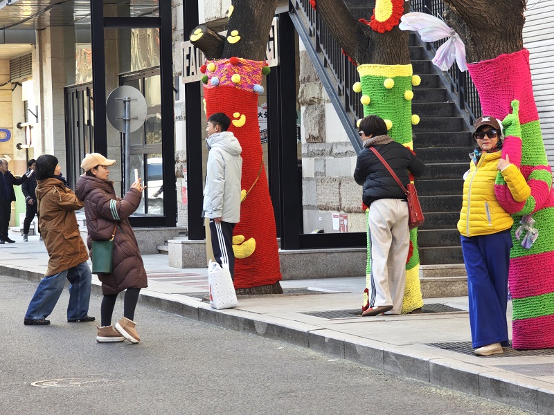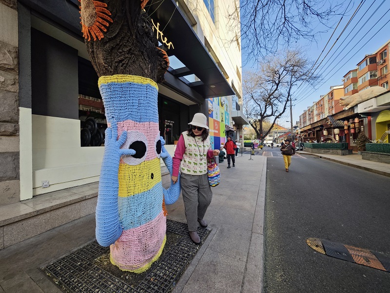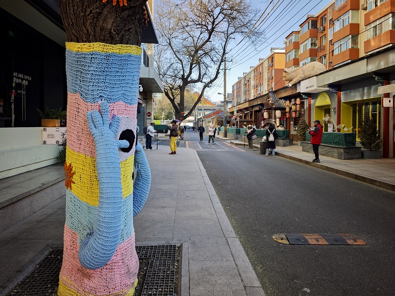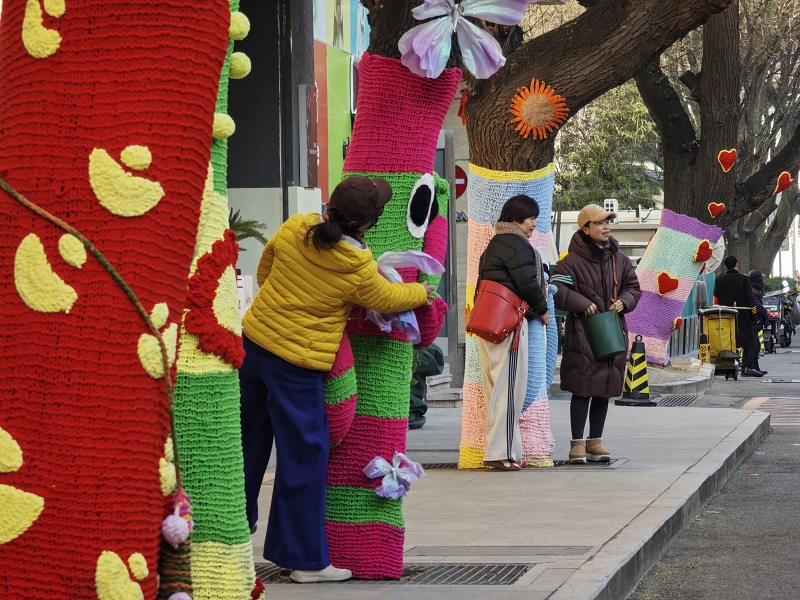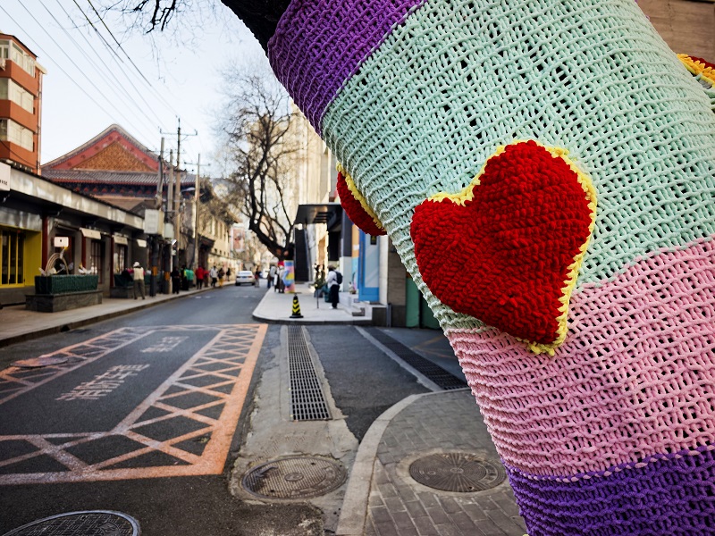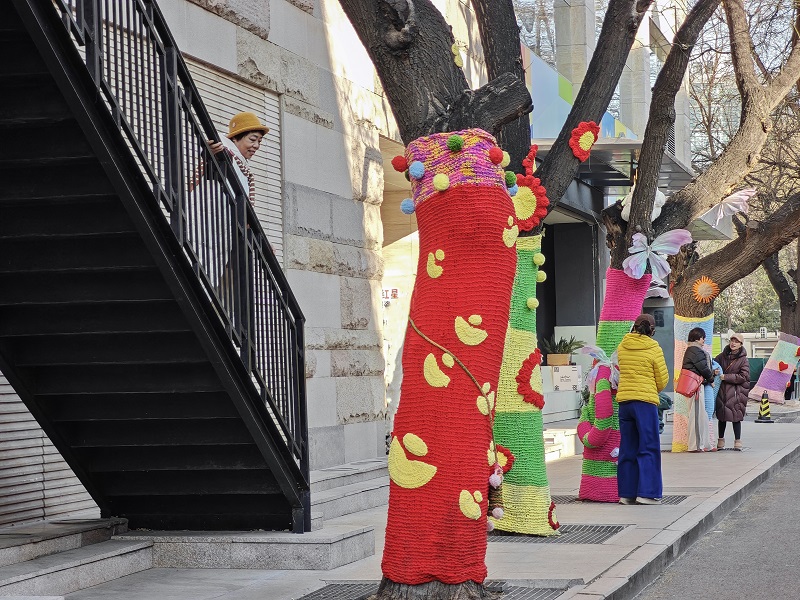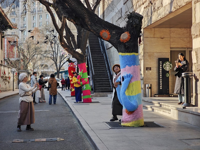 入冬后,北京东城区红星胡同的大树穿上“毛衣”,成为了网红打卡地。在金宝汇购物中心南侧的红星胡同,五棵大树约2.5米高的树干被五颜六色毛线拼接缠绕,像穿上“毛衣”,还装点着手臂、花朵、元宝、向日葵、爱心等毛线织成的精致立体图案,拟人效果拉满。