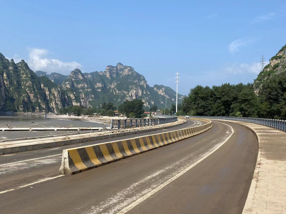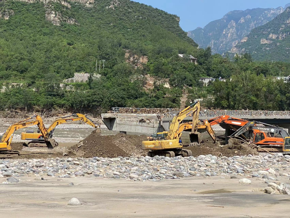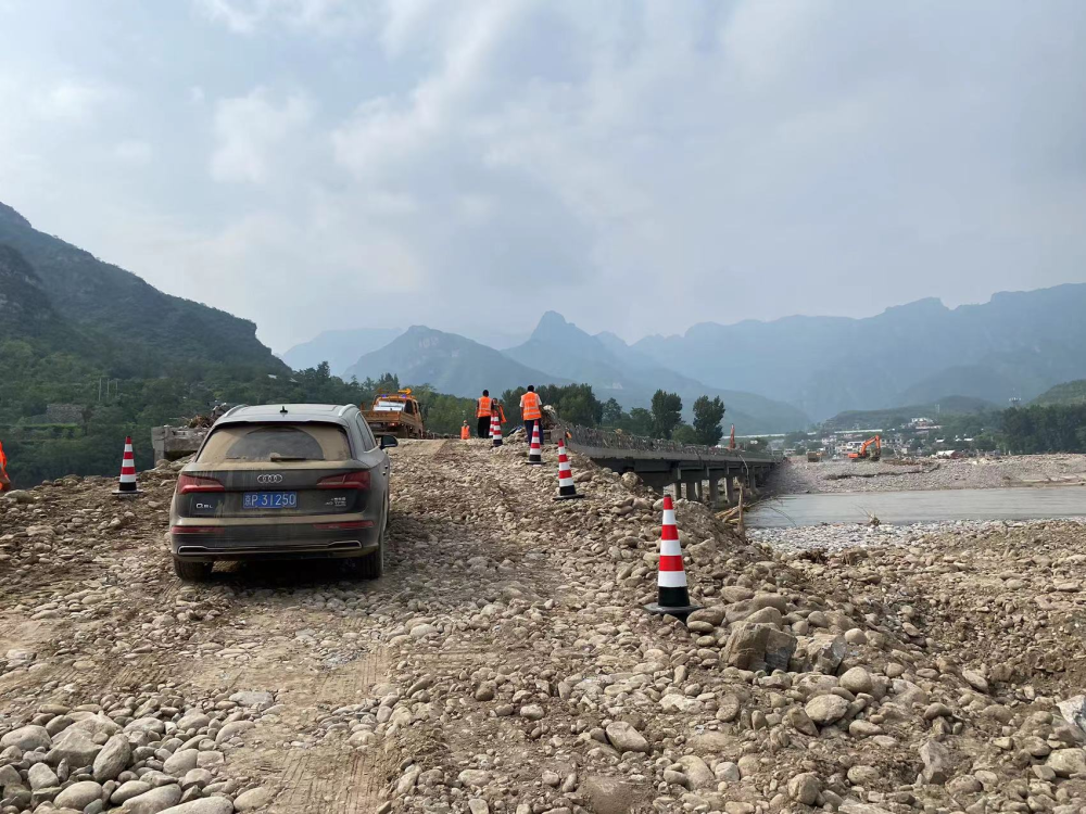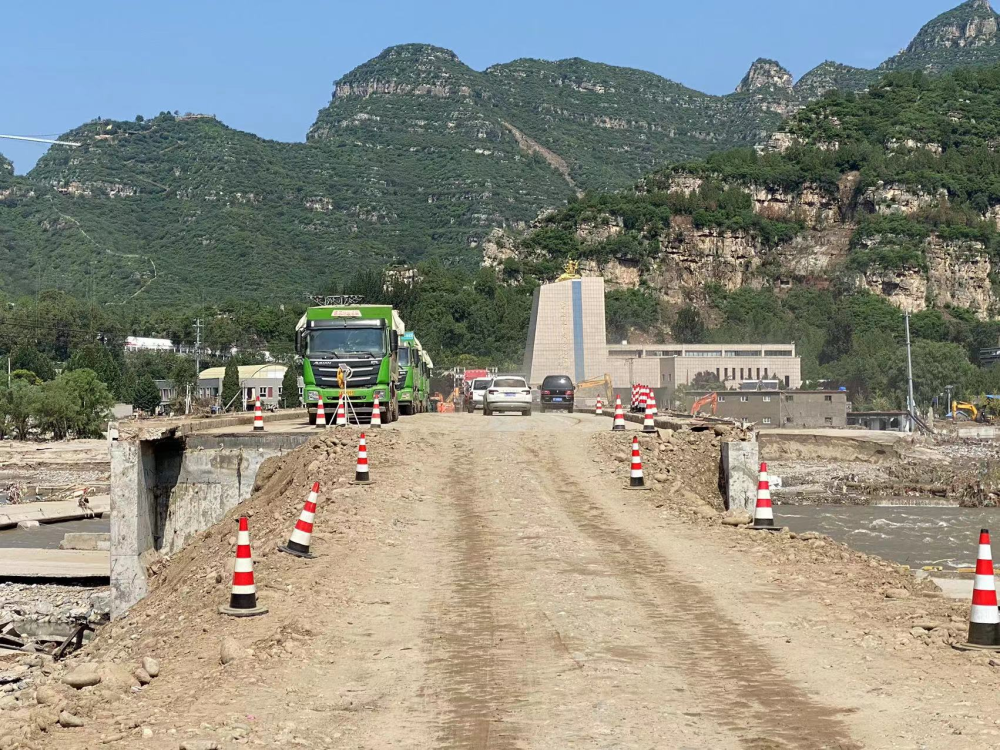 北京市房山区,抢险施工人员正在抢修受损桥面。