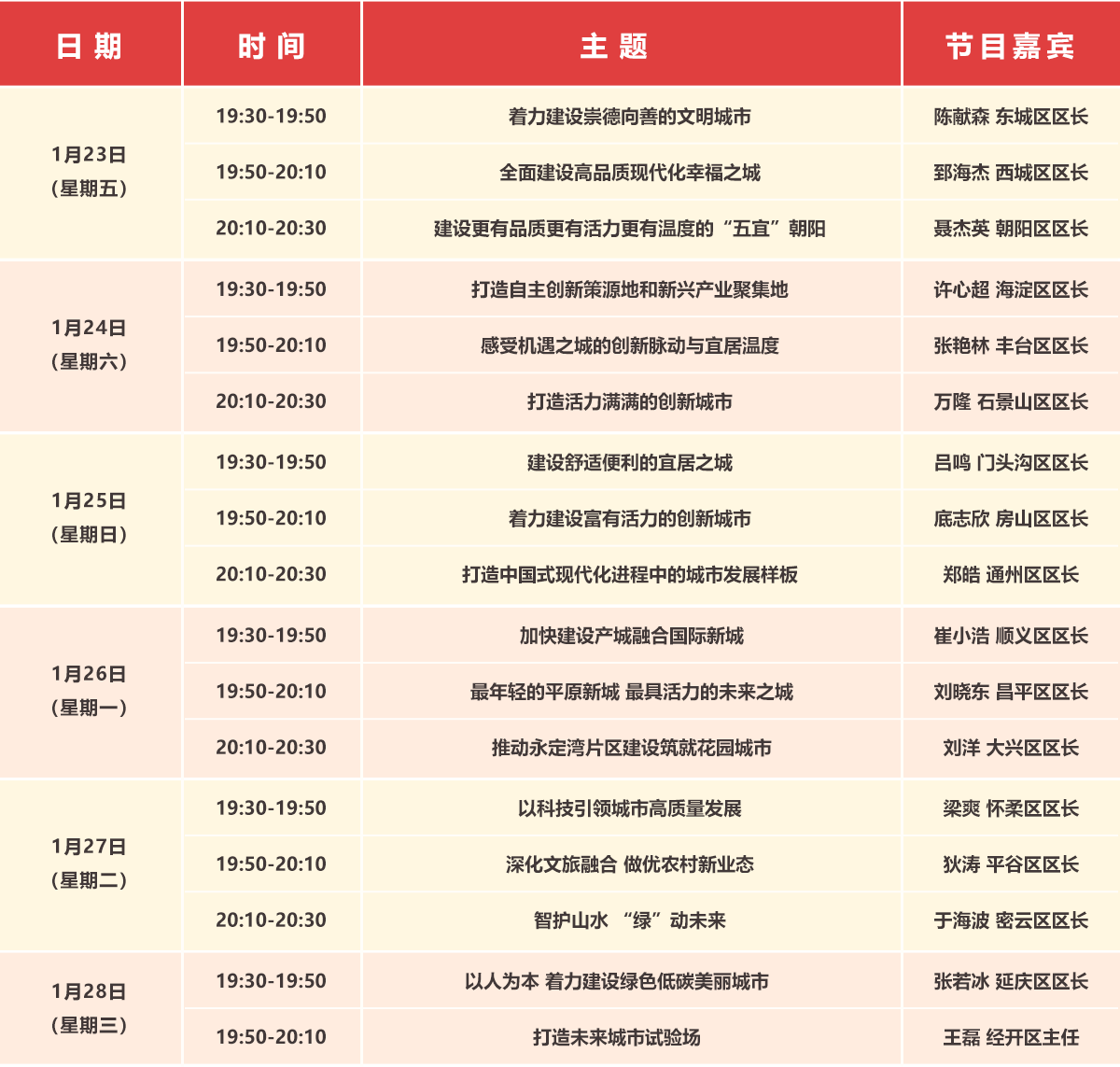 2026年1月23日19:50,由北京市政务服务和数据管理局主办的“市民对话一把手”节目播出第2期。本期节目中,西城区区长郅海杰围绕“建设现代化人民城市”主题,在基层开展调研并接受访谈,重点介绍全面建设高品质现代化幸福之城,梳理群众企业普遍关切问题,并在节目中予以回应解答。