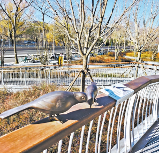 冬日午后,昆玉河水静静流淌,河东岸玲珑路与蓝靛厂南路交叉路口南侧绿地中,休闲廊道蜿蜒向前。沿廊道漫步,不时就遇小“惊喜”:金鸻鸟、黑脸噪鹛、红颈滨鹬……一组组“铜雀”立在扶手上,胖胖的,边上还有铭牌介绍。来到悬空的“塔影台”远眺,慈寿寺塔在望。近处,孩子们在游乐设施的网绳区攀爬,老人在健身器材处锻炼。