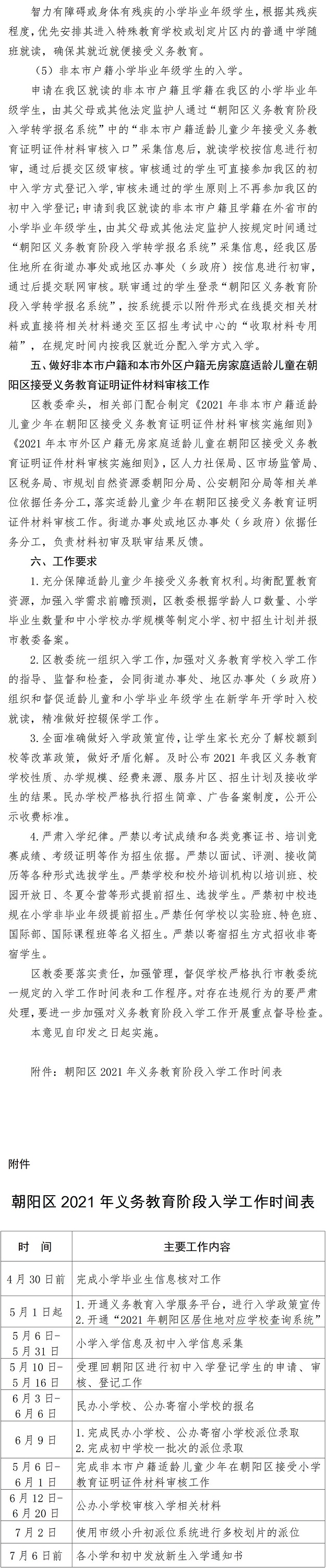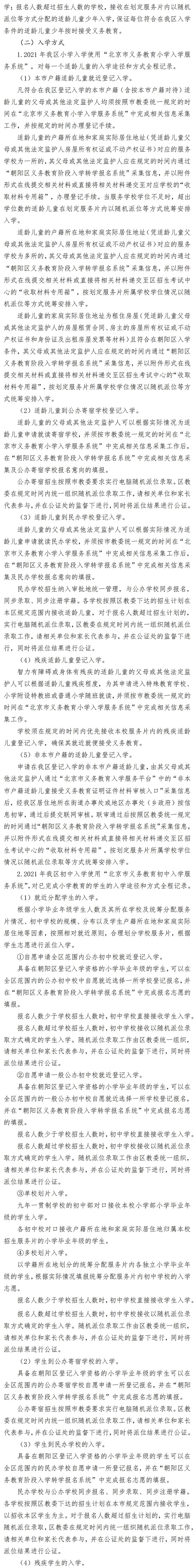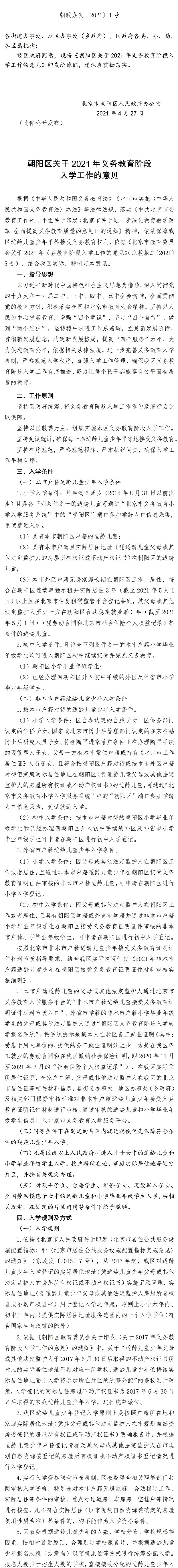 北京市朝阳区人民政府办公室印发《朝阳区关于2021年义务教育阶段入学工作的意见》的通知