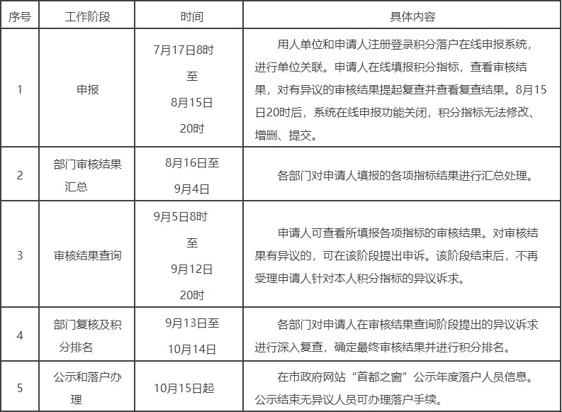 本市积分落户工作为年度申报制。2020年申报工作分为申报、部门审核结果汇总、审核结果查询、部门复核及积分排名、公示和落户办理5个阶段。各阶段安排如下: