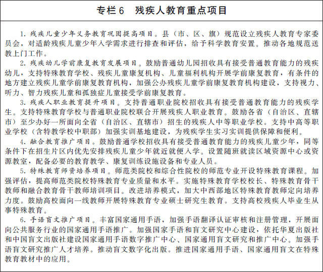 6.完善特殊教育保障机制。发挥高校等机构特殊教育专业优势,建设国家和省级特殊教育资源中心(基地)。各省(自治区、直辖市)根据残疾学生规模、类型、分布等情况,因地制宜合理配置特殊教育资源。支持符合条件的儿童福利机构单独设立特教班、特教幼儿园、特教学校开展特殊教育。继续改善特殊教育学校办学条件,加强特殊教育学校规范化建设,推行新课标新教材,改革教学教研,建立学校、家庭、社会协同育人机制。加强特殊教育师资队伍建设,创新培养方式,按国家有关规定开展表彰奖励,提升教书育人能力素质。加强特殊教育督导和质量监测评估。制定实施《第二期国家手语和盲文规范化行动计划(2021—2025年)》,加快推广国家通用手语和国家通用盲文。